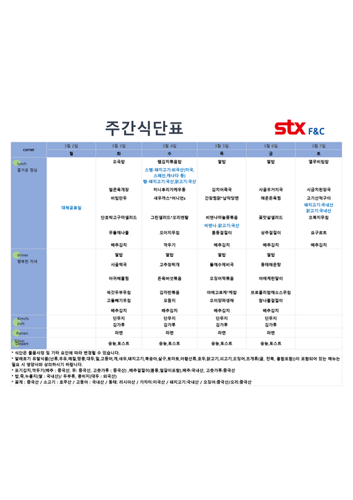 울산테크노파크매곡점 - 3월 1주 식단표